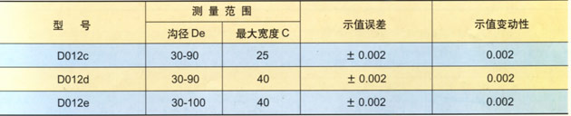 本儀器是比較法機(jī)械式測(cè)量器。D012C用于測(cè)量向心球軸承外圈溝道的直徑和賀度、溝位置和溝側(cè)擺等的變動(dòng)量;D012d、D012e用于測(cè)量向心球軸承外圈溝道直徑和賀度的變動(dòng)量。